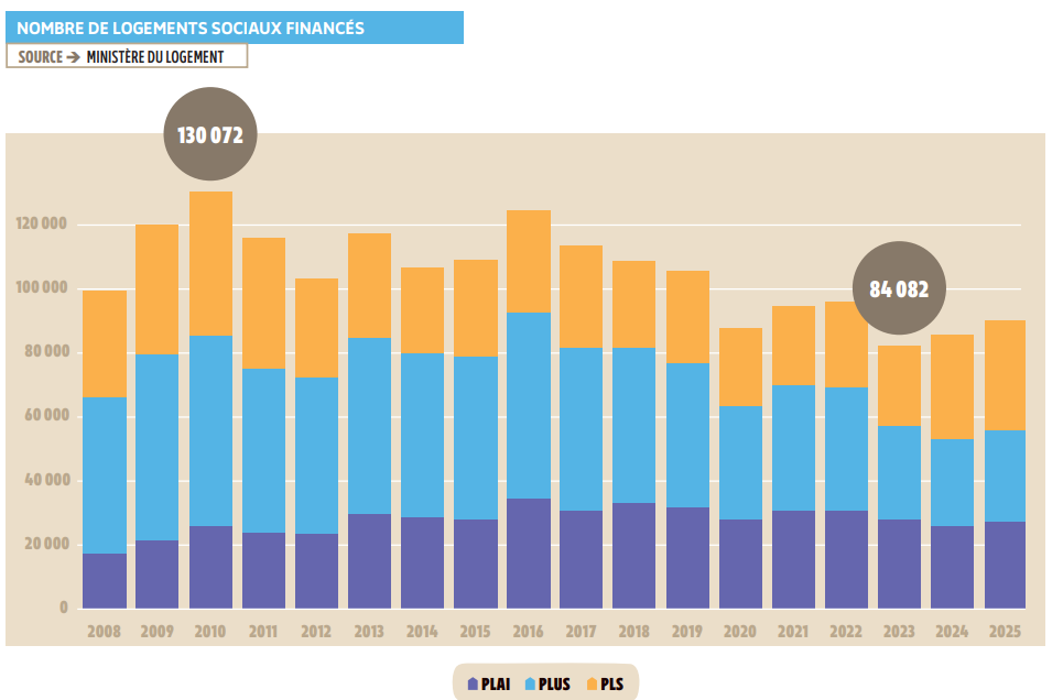 Il y a une chute de la production neuve avec 85 000 logements sociaux financés en 2024, ce qui est loin de répondre aux besoins : il y a désormais une file d’attente de 2,9 millions de ménages pour un logement social en France. Le logement social est délaissé : on observe une hausse de la TVA sur la construction de logement social et une ponction exercée par l’Etat sur les organismes HLM de 1,3 milliard d’euros.